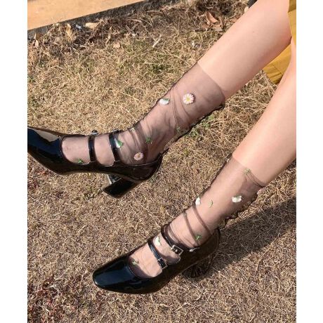 ガーリーでロマンティックなムード漂う、シアー素材のマーガレット刺繍ソックス。