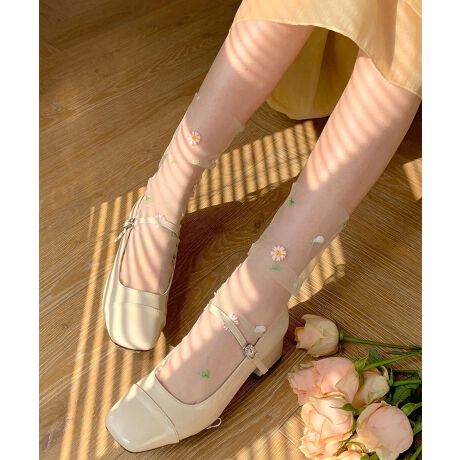 ガーリーでロマンティックなムード漂う、シアー素材のマーガレット刺繍ソックス。
