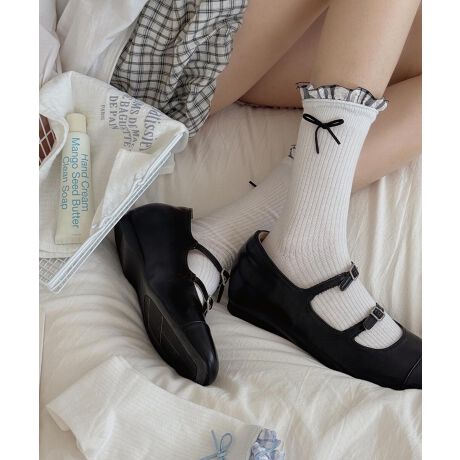 ホワイトベースに淡色リボンの組み合わせが可愛い、清楚系ガーリーソックス。さりげない透け感とフリルデザインで、スカートやワンピにぴったり。気分で選べるリボンカラーがコーデのアクセントに。足元から女の子らしさを出したい人におすすめの1足です?