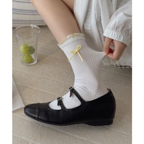 ホワイトベースに淡色リボンの組み合わせが可愛い、清楚系ガーリーソックス。さりげない透け感とフリルデザインで、スカートやワンピにぴったり。気分で選べるリボンカラーがコーデのアクセントに。足元から女の子らしさを出したい人におすすめの1足です?