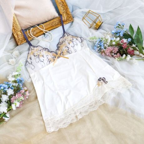 咲きほこる二輪草をイメージしたお花と、ツタを表現した曲線をふんだんにあしらったシリーズです。二輪草はあたたかみのあるウーリー糸で刺繍して、やわらかく可愛らしい表情をプラス。対照的に色とりどりの曲線は太めのステッチやラメ糸、ドット柄をほどこすことで、ひときわ華やかな印象に仕上がりました。まるで二輪草が光に照らされているかのような、きらめきが幾重にも折り重なる、幻想的な世界観を表現しています。カップの中央にはキラキラと輝くストーンチャームをあしらいました。身生地はアシンメトリーなカッティングと、裾の幅広レースで大人の上品さを演出。ポイントでインパクトのあるアップリケをプラスしました。バックスタイルは小さなリボンをほどこした、デイリー使いしやすいベーシックなデザインに。色使いは全体的にはっきりとした配色で、おしゃれで豪華な印象の新しいリサマリをお楽しみいただけます。