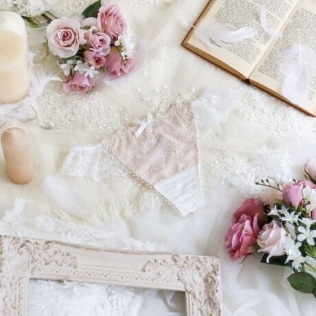 ふんわりとした羽根をイメージしたデザインと、繊細なラメ糸を上品にミックスさせたシリーズです。フロントレース全体に細やかなステッチで小花と羽根を刺繍して、ワントーンながらも華やかさをプラス。その上からふわふわと舞い落ちたような羽根のアップリケをあしらうことで、立体感と儚さを演出しました。色使いもエレガントなアッシュカラーでまとめた、毎日にそっと寄り添ってくれるようなコレクションです。