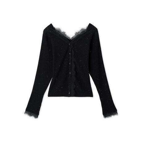 柔らかいタッチでウール混の糸にラメ糸とスパンコールを撚糸した華やかなニットプルオーバーは華奢なレースがデコルテ周りを飾り、華やかで上品な印象です。
