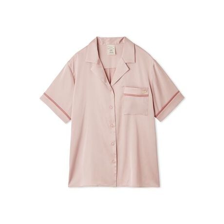 残暑の時期にも、洗練の大人スタイルを快適にお楽しみいただける接触冷感のサテンシリーズです。1枚でさらっと着用いただける半袖の開襟シャツは、パイピング入りの上品なデザイン。ゆとりのあるシルエットで、胸元にはロゴ入りのゴールドプレートもあしらいました。上からカーディガン等を羽織って調整すれば、秋まで長くお楽しみいただけます。色はベージュとピンク、グレーの3色展開。同シリーズのロングパンツやアイマスクとのコーディネートもおすすめです。