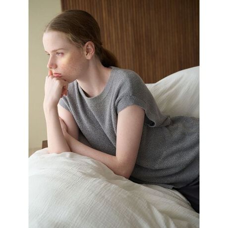 肌当たりなめらかな‘スムーズィー’に、きらきらと光るラメ糸を引き揃えて編んだ華やかなニットシリーズです。ニュアンスカラーがスタイリッシュな、ゆったりシルエットのベスト。1枚でざっくりと着用したり、お手持ちのTシャツなどにレイヤードしてもお楽しみいただけるアイテムです。左裾に入れたロゴ刺繍にもラメ糸を使用しました。同時期に展開する、接触冷感のサテンシリーズとのコーディネートもおすすめです。