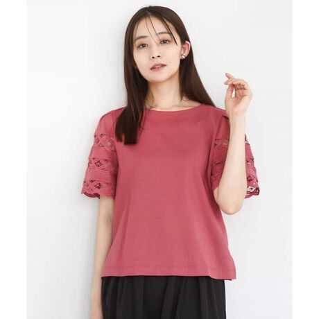 レース袖デザインが大人可愛い印象のコットン100カットソーです。裾にはスリットが入っており、裾アウトにしてもバランスが取りやすい着丈です。程よい肉感で体のラインを拾いにくく、二の腕カバー力もあります。汗ばむ季節に嬉しい接触冷感、UVカット機能付きです。