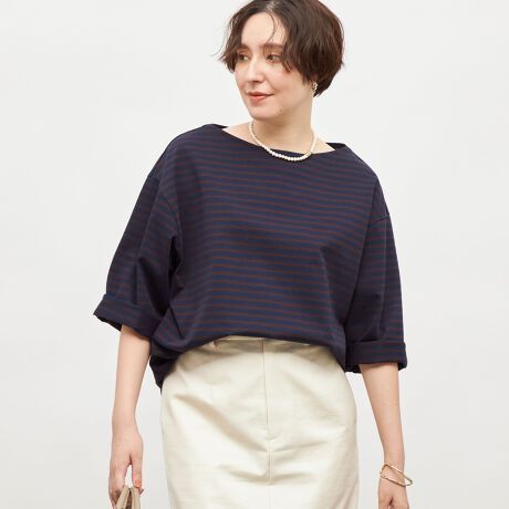 ・程よく秋のあるボートネックが顔周りをすっきりと見せてくれ、カジュアルさの中にも女性らしさを感じるアイテム