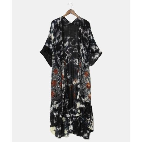 [型番:IDS-5223-2025]大胆なタイダイ柄に、スクリーンプリントと箔プリントを施した目を引くアイテム。薄手のレーヨン素材でサラッと羽織れる。裾がボリュームたっぷりなので、動くたびに揺れるシルエットを楽しめる。インド映画に出てきそうなエキゾチック感を演出してくれる。