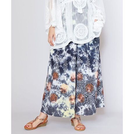 [型番:IDS-5224-2025]大胆なタイダイ柄に、スクリーンプリントと箔プリントを施した目を引くアイテム。動くたびに揺れるフレアパンツ。薄手で軽いレーヨン素材。ウエスト調整可能な外紐も付いており、タッセルにはインドらしい金のビーズが輝きアクセントにもなる。