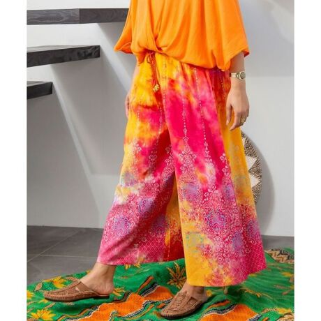 [型番:IDS-5224-2025]大胆なタイダイ柄に、スクリーンプリントと箔プリントを施した目を引くアイテム。動くたびに揺れるフレアパンツ。薄手で軽いレーヨン素材。ウエスト調整可能な外紐も付いており、タッセルにはインドらしい金のビーズが輝きアクセントにもなる。