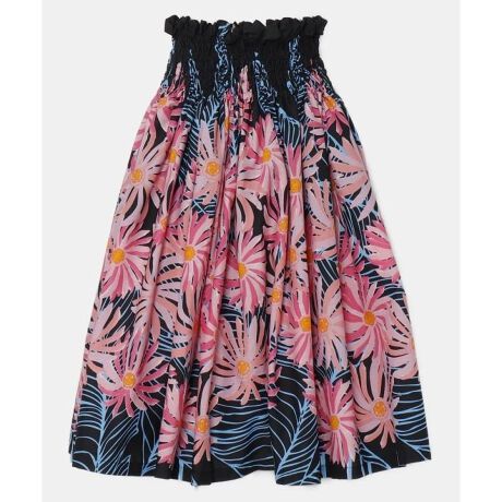 [型番:YJJ-3103-2025]【使用生地:ZK000417 ガーベラ/ブラック系 ハワイアンファブリック】マウナロアオリジナルファブリックの既製品シングルパウ。4ヤード(約3.6m)のたっぷりギャザーに安定のウエスト4本ゴムを使用。ご自身で調整できるウエストゴム仕様です。