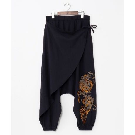 [型番:IDS-5227-2025]着心地のよいコットン素材の変形サルエルパンツ。繊細ながらも大胆にプリントされたロータスの柄と、流れるような切り替えのフラップがコーディネイトを引き立たせます。ウエストサイズ調節可能。