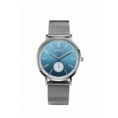 BERINGのコレクションの中でも特徴的で美しいアイスブルーのカラーダイヤルが大空に広がるオーロラを表現しています。オーロラと白い大地のコントラストをイメージして、インデックスやダイヤルの外周に使用されたホワイトも印象的。スモールセコンドには上空から氷山を見下ろしたように見える薄い模様が施されています。