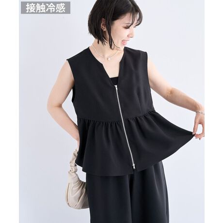 ナチュラルな雰囲気が魅力的なリネンライク素材で仕立てたベスト。ウエスト下でギャザーたっぷりに切り替えたフィット&フレアなシルエットがスタイルアップを後押しします。上下どちらからでも開閉できるファスナーで着こなしに応じたアレンジもおすすめ。合わせ方次第でロングシーズン活躍するおすすめのアイテムです。透け感[なし]