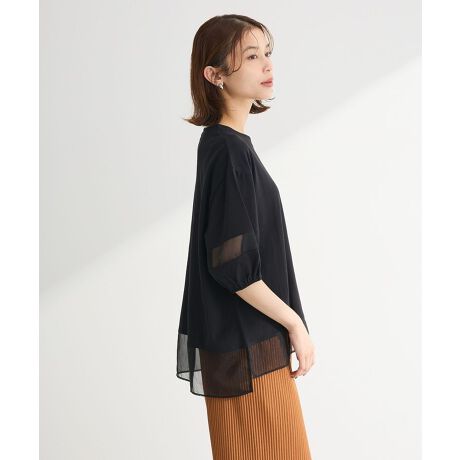 カジュアルにもフェミニンにも合わせやすいデザインTシャツ。袖口と裾にシアー素材を合わせ、シンプルながらこなれ感のあるスタイルを演出します。程よくゆとりのあるサイズ感で着心地良く、華奢見えするのも嬉しいポイント。ボトムを選ばず、デイリーに活躍するおすすめのアイテムです。