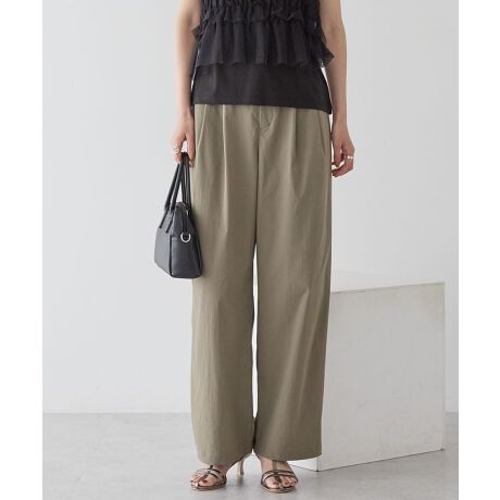 メンズライクなナイロン素材のタックパンツ。太めのウエストベルトと、タックから広がる程よいワイドシルエットがポイントのデザインです。暑い季節も涼しげに着られる軽い素材を使用。アイボリーには裏地がついており、安心して着用頂けます。きれいめからカジュアルまで幅広いコーディネートに対応できる万能なアイテムです。透け感[なし]