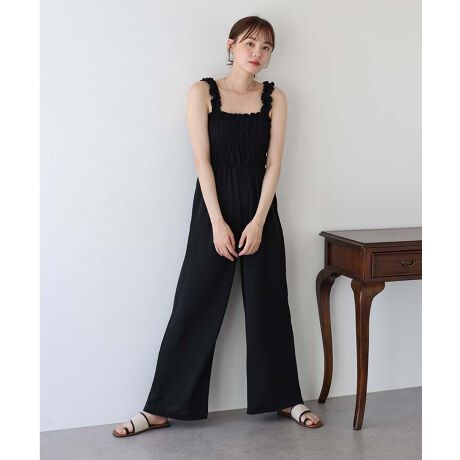 くしゅくしゅっとした肩紐シャーリングが可愛いオールインワン。