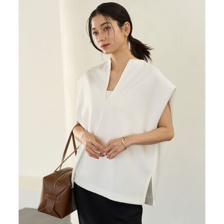 ■デザインシャープなVラインのキーネックデザインで、スウェット感覚で着用できるトップス。手軽に着用できるラクさながら、きれいめな印象を叶える便利な1着。ハリ感となめらかな風合いで、カジュアルダウンしすぎずに女性らしい雰囲気で着用していただけます。体が泳ぐサイズ感とサイドの深めスリット、肩タックなどを使った構築的なフォルムも魅力です。同素材のタイトスカート(SKURGA0150)とのセットアップもおすすめ。