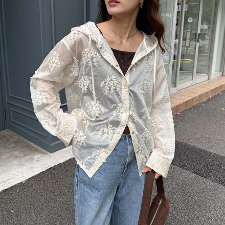 繊細な刺繍と透け感で魅せる、大人のフードシャツ