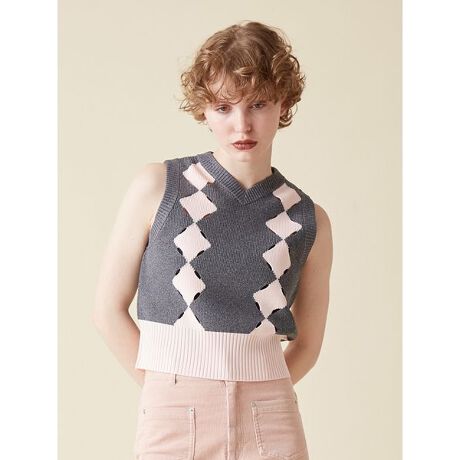 今期のキーワードであるトラッドテイストを感じるニットベスト。以前好評いただいたアイテムのアップデートデザインです。アーガイル柄の周囲にスリットを入れ、独自のデザイン性を加えた一枚。スリットからインナーを覗かせることで重ね着を楽しむことができ、コーディネートの幅が広がります。クラシックでありながらも現代的なアレンジを加えたスタイルが楽しめる万能なアイテムです。透け感;なし