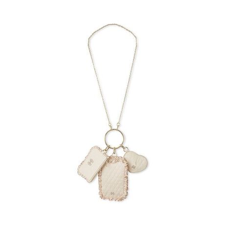 マチありのスクエア型ポーチと、同素材のフラットなティッシュポーチ、小さなハート型ポーチをキーリングで繋いだマルチショルダーです。