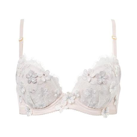 −幸せを運ぶスズラン− フランス・パリ街中がミュゲ(スズラン)であふれる初夏のパリ。フランスにはミュゲを大切な人と贈り合う「ミュゲの日」があり、受け取る人だけでなく、贈る人にも幸せが訪れると言われています。そんな素敵な習慣にちなみ、可憐なケミカルアップリケをふんだんに飾ってロマンティックなデザインに。ラッキーチャームが幸せを運んできてくれそう。●自分に合わせて、胸の谷間をきれいにととのえる 前中心の低いワイヤーを使い、脇寄せを強くすることで、胸の谷間を美しく見せる●サイズに合わせたバストメイクを <(C〜E)カップ>…ピタッとパッドでボリュームアップ <(E〜G)カップ>…サイドパネルでシルエットすっきり <Gカップ>…下カップのボーンでバストをささえる・カップは、アイラッシュレースの上にパッカーの手法で立体感を表現したチュールエンブロイダリーレースを重ね奥行き感を表現・クリスタルやラメ糸で輝きをプラスした2種類のケミカルアップリケをふんだんにあしらったラグジュアリーな仕様・□ゴールドカラーの金具がアクセント□のループを組み合わせた□ストラップで、センシュアルなバックスタイルに