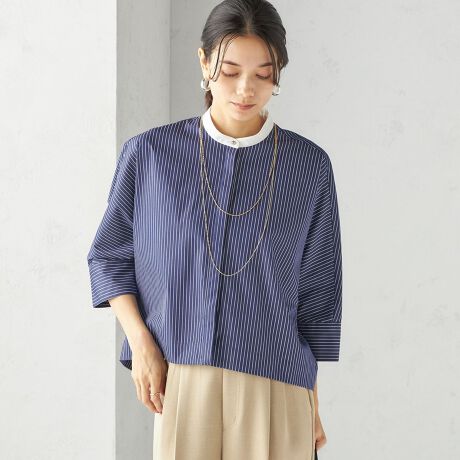 ドルマンスリーブのゆったりとしたシルエットですが、綿のハリ感を出しきちんと感を演出できるシャツにしました。