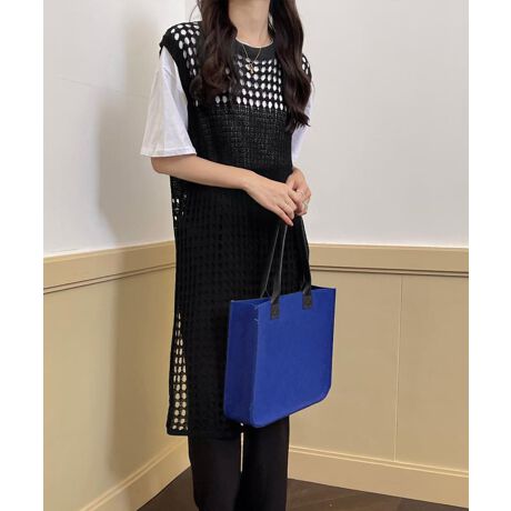 夏らしい抜け感を演出する透かし編みデザインのロングベスト。