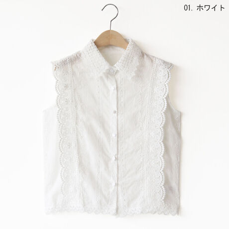 レースの襟や装飾が印象的なノースリーブブラウス。