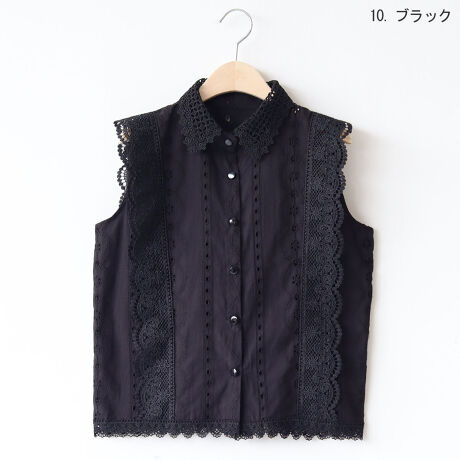レースの襟や装飾が印象的なノースリーブブラウス。