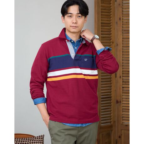 前身をパネルボーダーで切り替えた長袖ポロシャツです。鹿の子生地を使用し、さらっとした着心地が特徴です。ラガーシャツのようなボーダー配色に仕上げました。デニムやチノパンと合わせたスタイリングがオススメです。