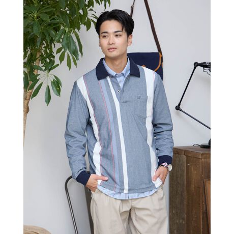 [型番:314R8454]前身をストライプで切り替えた長袖ポロシャツです。鹿の子生地を使用し、さらっとした着心地が特徴です。デニムやチノパンと合わせたスタイリングがオススメです。
