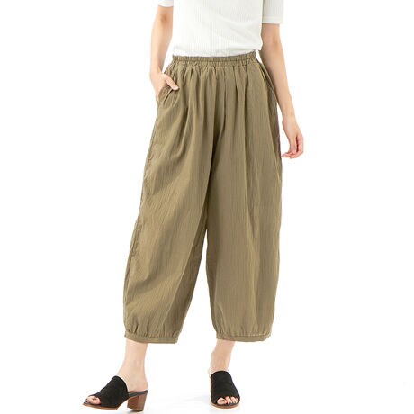 軽やかな綿PU素材にシワ加工を施し、ナチュラルな風合いに仕上げたバルーンパンツです。