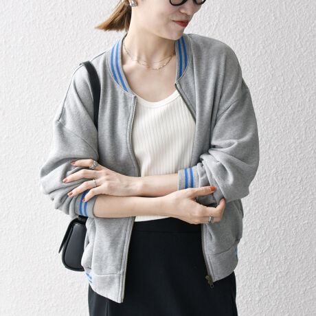 スポーティな印象のラインリブと背中のロゴがポイントのジップアップブルゾン。