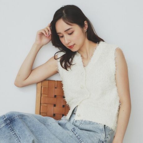 フリンジシャギーにパール調の釦が上品なコンパクトベスト