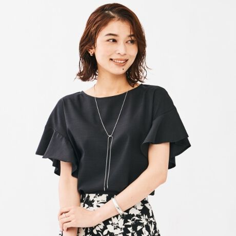 花びらのような華やかなフリル袖が女性らしいブラウスです。