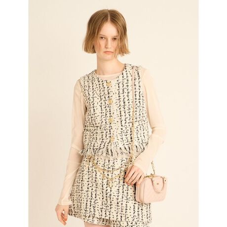 RWFS254051とセットアップ品番のツイードベスト。共地のフリンジとチュール素材を贅沢に使用し、4枚重ねにした華やかな裾がこだわりのポイント。1枚でも着用できるようにあえてサイズはコンパクトに、見返し無しの仕様で肌にツイードがあたらないようにしました。デニム等のカジュアル系アイテムからフェミニン系どちらとも相性が良く、重ね着も可能。着回しの広さも魅力の一着です。