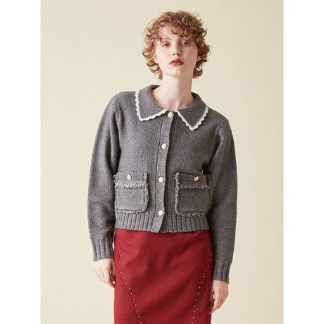 ツイードジャケットのエレガンスをニットで表現したカーディガン。フリンジ付きの小さなポケットがクラシカルな雰囲気を演出し、洗練された印象に。布帛よりも軽やかで動きやすく、肩の力を抜いてリラックスして着用できます。コンパクトなシルエットで、スカートにもパンツにもバランスよく馴染む、万能な一枚です。透け感;なし