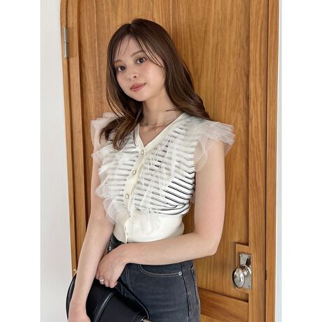 デコルテを美しく綺麗に魅せる、SNIDEL定番人気のチュールフリルをふんだんに挟み込んだ、毎シーズン人気のチュールフリルノースリニットが今季も登場。ボーダー柄も加えて4色展開にてお作りしました。柔らかなフリルディテールをフロントにたっぷりと取り入れてスタイリングを華やかに演出。襟ぐりは程よく抜け感をプラスするV開き、そして裾リブも太めに配置しており、ハイウエストボトムやボリュームスカートともバランスが取りやすいすっきりとしたデザインです。ボタンを閉めてノースリプルオーバーとしてのご着用がおすすめ。今季は、ボタンをフチありにしてリュクスに仕上げました。