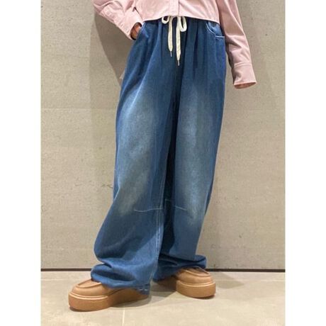 ウエストがぐるりゴムでイージーな履き心地のデニムパンツ。柔らかい薄手のデニム生地を使用し、モード感のある構築的なシルエットに仕上げました。後ポケットにFURFURのロゴ刺繍が入っています。