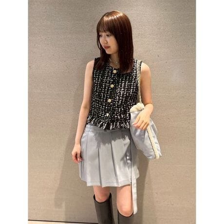 巻きスカート風の太い巾のプリーツミニスカート。トレンド感のある短めの着丈となっており、裏地は安心してお使い頂ける様、ショートパンツ型にデザインしました。裏地に釦を付け開き感を調節できるようになっているため、パンツのレイヤードができ様々なスタイリングでお楽しみ頂けます。共地のベルトが長めに垂れたデザインと、やや変形したシルエットがポイント。全色トラッドなチェック柄を使用しており、生地感も暑い気温でも安心して着られるサラッとした素材感となります。