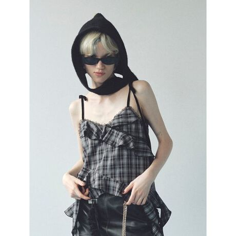 トラッドなチェック柄を使用しつつ、華やかなフリル使いが印象的なキャミトップス。端々にはレースやベロアリボンを使用し、フェミニンモードな印象に仕上げました。ゆとりのあるシルエットのため、インナーにシアー素材やニット素材などのトップスをレイヤードでき、様々なシーズンで着て頂けます。