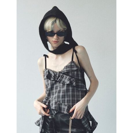 トラッドなチェック柄を使用しつつ、華やかなフリル使いが印象的なキャミトップス。端々にはレースやベロアリボンを使用し、フェミニンモードな印象に仕上げました。ゆとりのあるシルエットのため、インナーにシアー素材やニット素材などのトップスをレイヤードでき、様々なシーズンで着て頂けます。