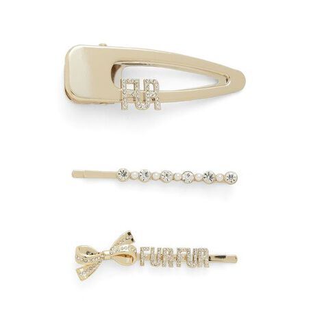 クリスタル装飾がキラキラと輝くヘアピンの3本セット。大胆にFURのロゴを落とし込んだヘアクリップは存在感抜群な大き目サイズ。デザインはシンプルなので合わせやすいのがうれしいポイントです。愛らしいリボンが印象的なロゴピンと、サイズ違いのパールとクリスタルを使用した賑やかな差しピンは2本合わせて使用することで華やかな印象に。組み合わせによってイメージを変えて楽しめます。