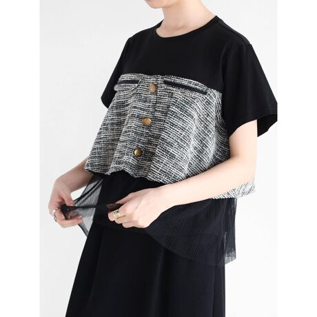 カジュアルなTシャツにツイード生地とチュールをドッキングした、レイヤード風トップス。