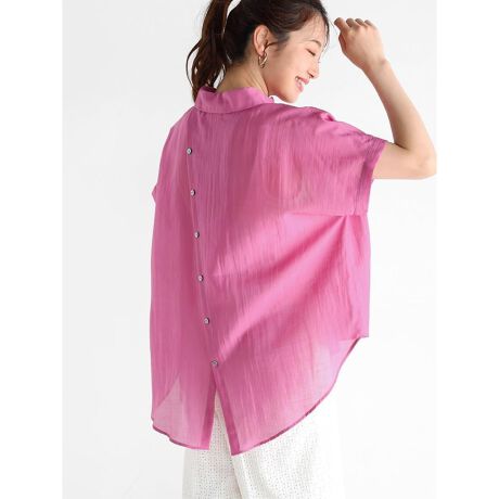 アシンメトリーのバックボタンデザインが特徴のシアーシャツ。