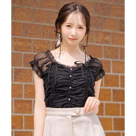 透け感チュールが誘う甘さに、ギャザーで旬な表情をプラス【Design】・涼やかなチュール素材にギャザーを寄せ、パールとリボンをトッピングしたデザイントップス。・肩のリボンと袖のフリルディテールが、甘すぎず上品な印象に仕上げてくれます。・コンパクトなサイズ感で、すっきりと着ていただけます◎・肩まわりの透け感が大人の抜け感を演出し、軽やかな印象で着こなせます。・裾のフリルがさりげなく可愛らしさをプラスしてくれる、着映え力抜群♪・ハイウエストボトムと合わせれば、自然とスタイルアップが叶います。【Fabric】・ボディには肌触りの柔らかなカットソー生地を使用しているので、汗をかく季節でも快適◎・ご自宅でお手入れが出来るのも嬉しいポイント♪・ホワイト、ピンク、ブラウン、ブラックの4色展開となります。【Care】手洗い可能