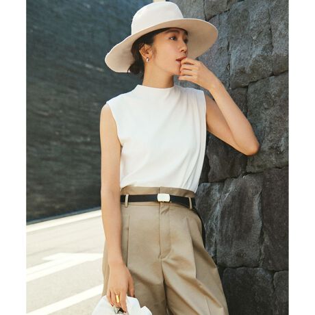 総針で編み立てた、ミニマルなシルエットが美しいスリーブレスニットです。 ボディラインを拾いにくい絶妙なサイズ感で、すっきりと着こなせます。 シンプルなモックネックデザインは、どんなスタイルにも合わせやすく、一枚でぐっとこなれ感を演出します。 同素材のスカートやパンツと合わせてセットアップスタイルを楽しむのはもちろん、ワイドパンツやボリュームスカートとの相性も抜群です。 これ一枚で、初秋の洗練されたルックが完成します。 カーディガンやジャケットのインナーとしても活躍し、同素材のカーディガンとアンサンブルでの着用もおすすめです。カラーは、清潔感のあるホワイト(#001)、洗練された印象のグレー(#004)、印象引き締まるブラック(#005)の3色展開です。