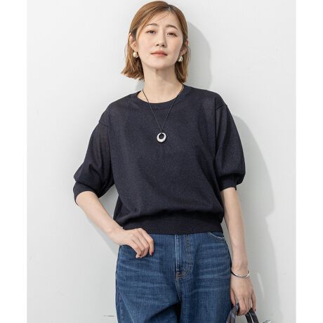 軽やかで涼し気なシルエットと繊細なラメの輝きが魅力のニットT。ややパフ型に仕上げたハーフスリーブと、締め付けすぎないゆったりとしたシルエットが、リラックス感と抜け感を同時に演出します。カジュアルなデニムから、きれいめなスカートやパンツまで、幅広いボトムスと相性抜群で、オンオフ問わず着回せる万能さが魅力。一枚で華やかさをプラスでき、コーディネートの主役として活躍します。カラーは、シックなネイビー(#075)、肌なじみの良いゴールド(#090)、涼し気な雰囲気のシルバー(#091)の3色展開です。