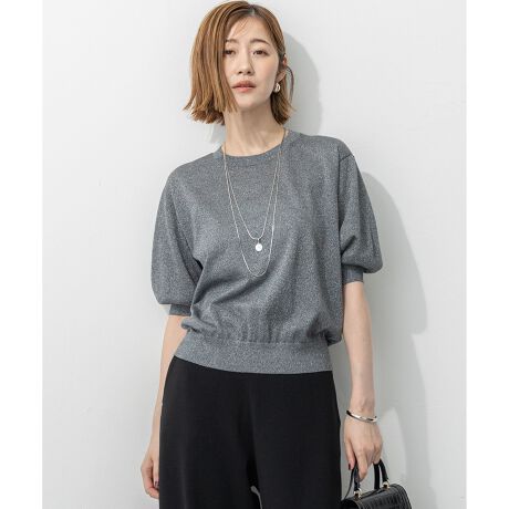 軽やかで涼し気なシルエットと繊細なラメの輝きが魅力のニットT。ややパフ型に仕上げたハーフスリーブと、締め付けすぎないゆったりとしたシルエットが、リラックス感と抜け感を同時に演出します。カジュアルなデニムから、きれいめなスカートやパンツまで、幅広いボトムスと相性抜群で、オンオフ問わず着回せる万能さが魅力。一枚で華やかさをプラスでき、コーディネートの主役として活躍します。カラーは、シックなネイビー(#075)、肌なじみの良いゴールド(#090)、涼し気な雰囲気のシルバー(#091)の3色展開です。